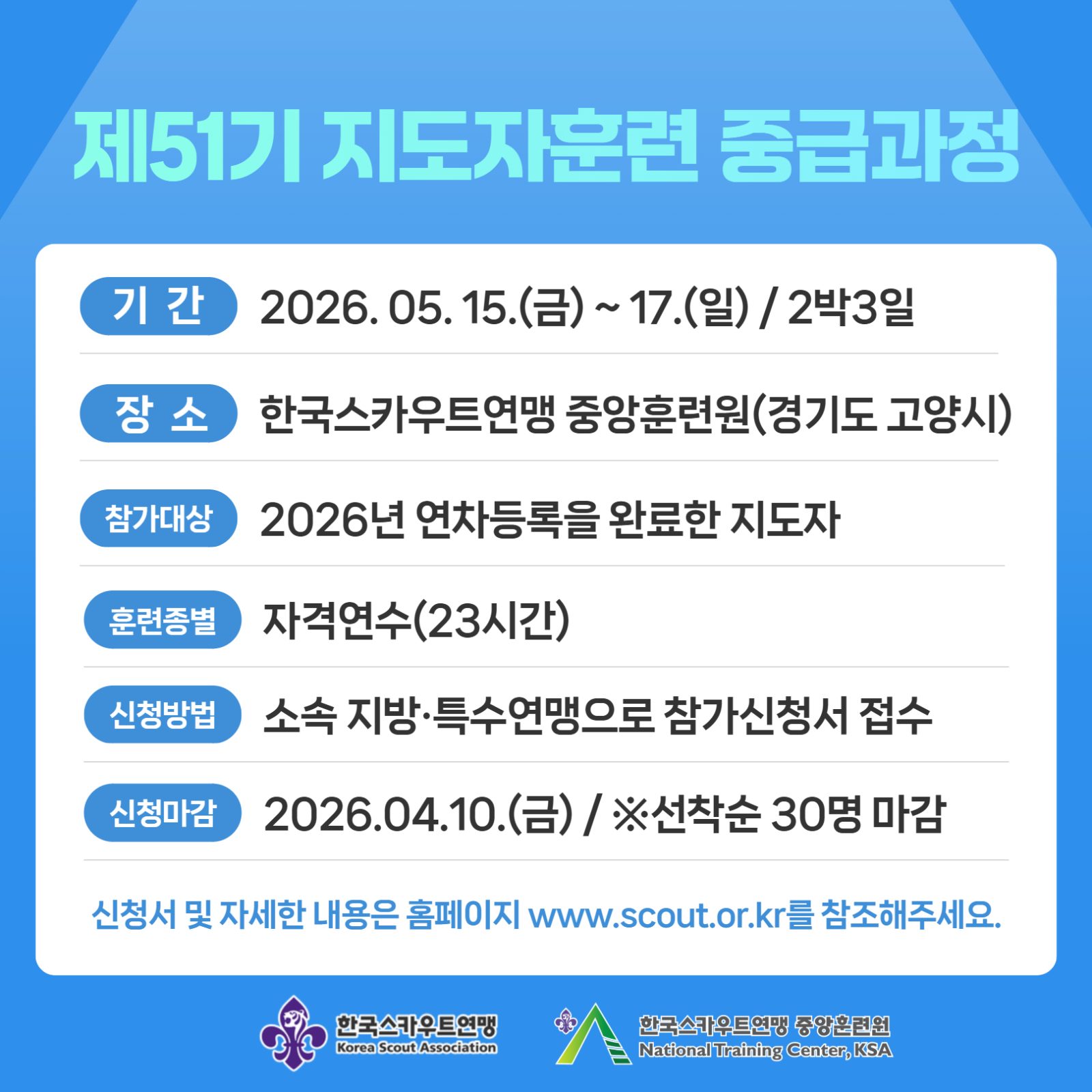 이번 과정은 2026년 5월 15일(금)부터 17일(일)까지 2박 3일 일정으로 경기도 고양시에 위치한 중앙훈련원(서삼릉청소년야영장)에서 진행된다. 지도자훈련 중급과정은 스카우트 지도자의 역량을 강화하고 프로그램 운영 능력을 높이기 위해 마련된 교육과정이다.