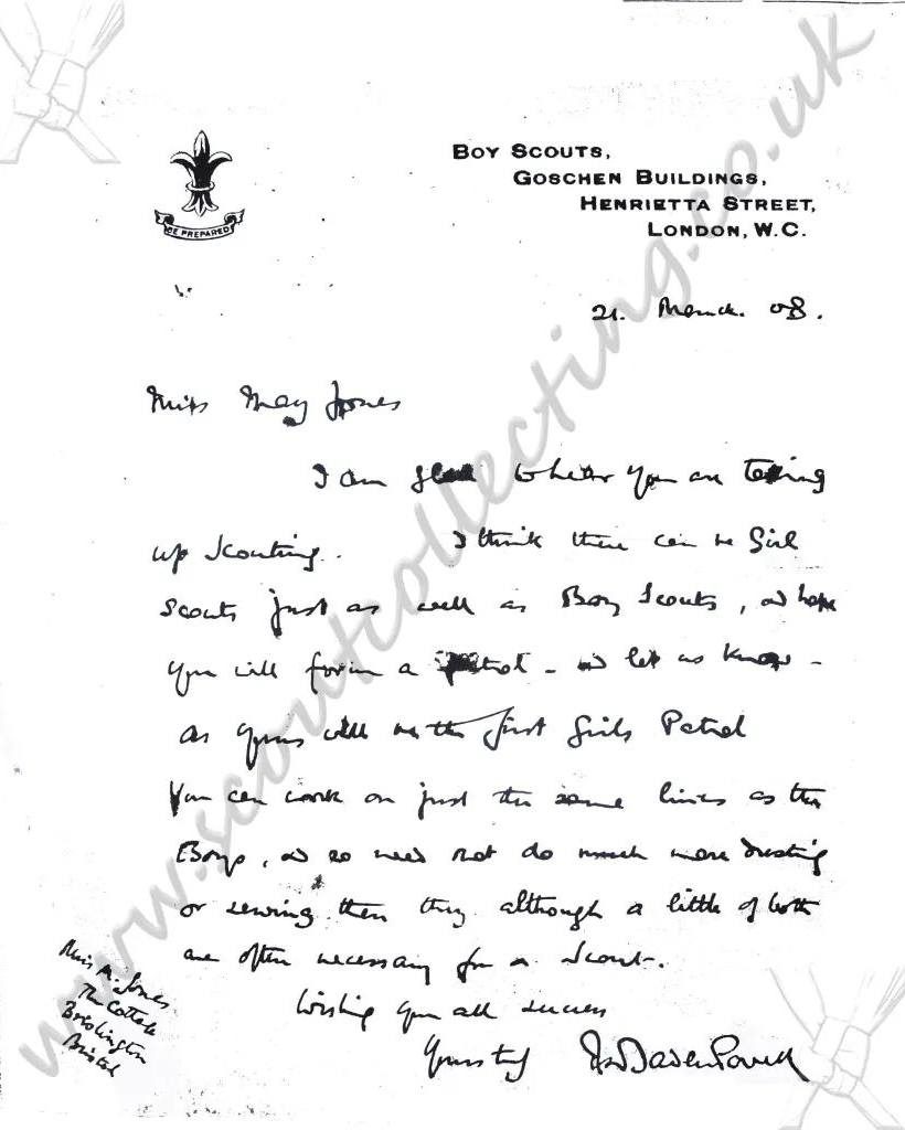해당 서한에서 베이든파월은 “여성 스카우트도 남성과 마찬가지로 가능하다”며, 메이 존스가 반을 조직할 경우 최초의 여성 스카우트 반이 될 것이라고 언급했다. 또한 활동 방식 역시 기존 보이스카우트와 동일한 기준을 따를 수 있다고 설명했다.